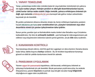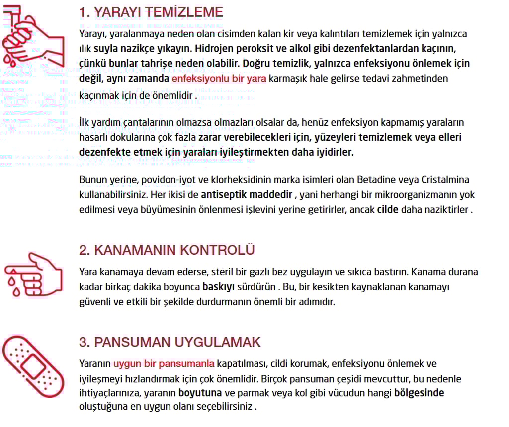 Yarayı temizleyin, kesikten kaynaklanan kanamayı durdurmak için hafifçe baskı uygulayın ve dezenfekte ettikten sonra pansumanla kapatın .